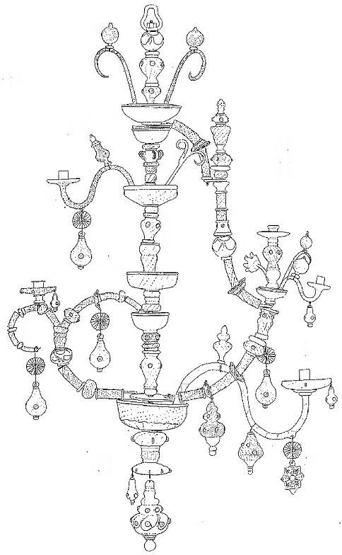 Sammen laget disse to utlendingene 3 fantastisk vakre lyse kroner som ikke ligner på noen andre. Det som er spesielt for dem er for det første formen, som er en kombinasjon av to kjente prinsipper for lysekronekonstruksjon, nemlig konsollkroner og korgformet oppheng. For det andre at hele metallskjelettet er dekket av glass, glassrør og kuler, og for det tredje at kronene er polykrome. Det er brukt både blått, manganfarget og grønt og gult glass i dem. Det fjerde uvanlig trekket er at de dekorative elementene er blåst og ikke slipt, som var det vanlige. Det man kunne ha forventet var at kronene var utformet som en kombinasjon av engelske og tyske lysekroner, men i stedet har de likhetstrekk med italienske og franske lysekroner.
