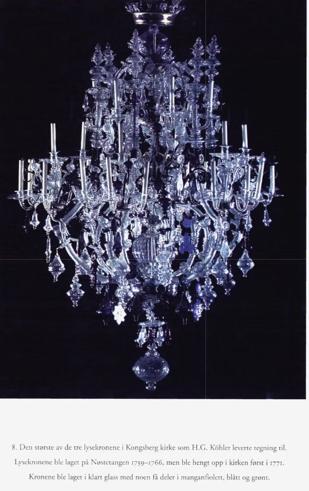 Det spesielle med de norske lysekronene er at de ble dekorert med blåste eller støpte elementer, ikke slipte prismer. Noen av delene kunne være i mørk blått eller dypt lilla glass.